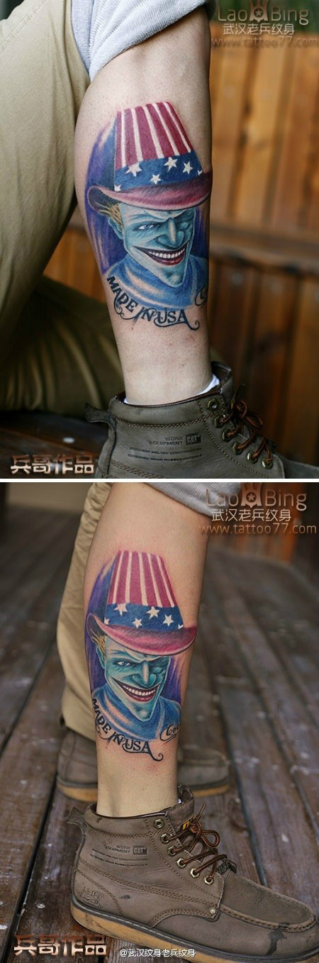 犀利的腿部小丑纹身由武汉专业纹身店老兵出品
