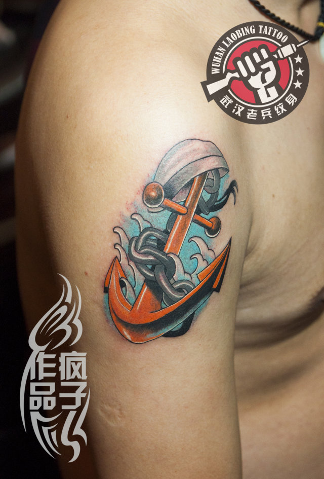 武汉最好纹身店打造的大臂彩色船锚纹身作品