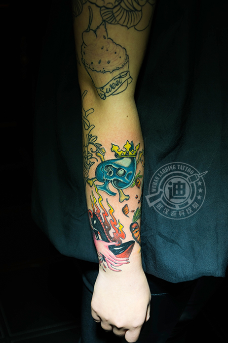 武汉最好纹身店打造的SCHOOL高跟鞋,桃心骷髅纹身作品