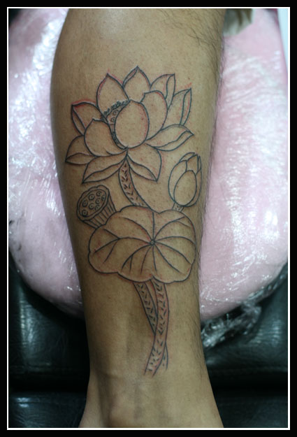 2010年元旦,客人要在腿纹一个莲花,有花苞,有花朵,有莲蓬的莲花纹身,经过一番思考,开始构图。