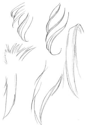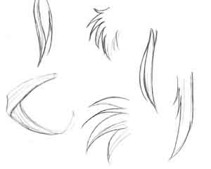 如同现实中的头发,漫画式头发也是由许多股发线组成。然而,比起单独画出每一股头发来,更好的方法通常是把它们画成不同大小、形状的发丛。如图所示,这是每种头发风格的一些最简单的形式。注意在大多情况下,在发丛的底部的线条更弯曲一些--如例图中最左上的例子尤为明显,较低的线比上边的线条曲度更大,让头发更富有深度,更加漫画化(anime- ish?)一些。 有时头发表现得很夸张,有时却仅能让人瞧见,不过大多数的漫画发型中,每股头发都会是这种基本的形状。