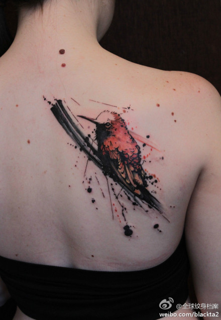 女生肩背时尚精美的水墨风格的蜂鸟纹身图案