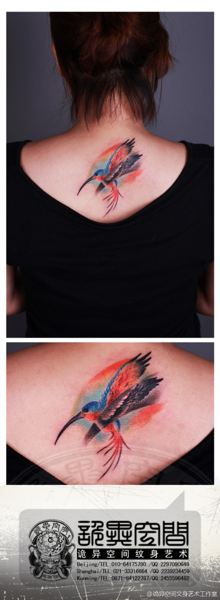 女生后背漂亮时尚的彩色蜂鸟纹身图案