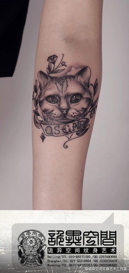 女生手臂一款潮流经典的黑灰猫咪纹身图案