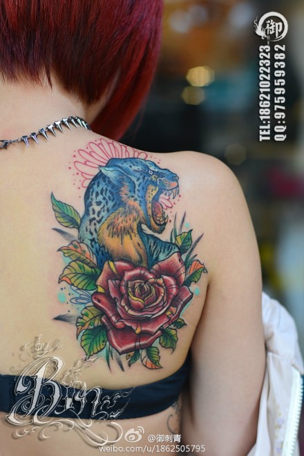 女生后背超酷经典的豹子与玫瑰纹身图案