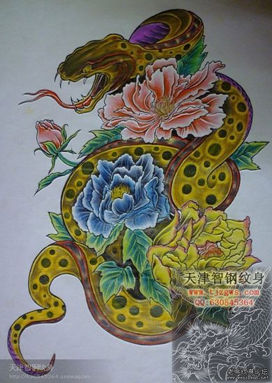彩色蛇牡丹纹身图案大全