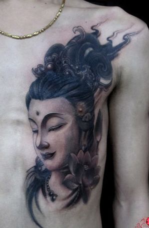 一款胸部彩色莲花佛头纹身图案纹身图片