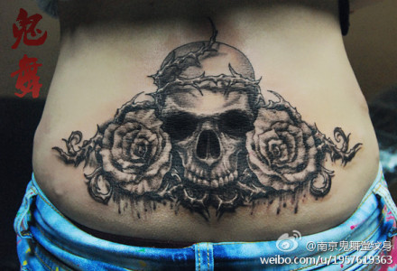 女生腰部潮流时尚的黑灰骷髅与玫瑰花纹身图案
