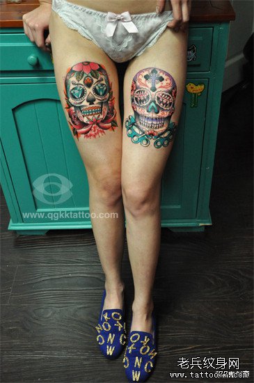 女生腿部唯美潮流的欧美花骷髅纹身图案