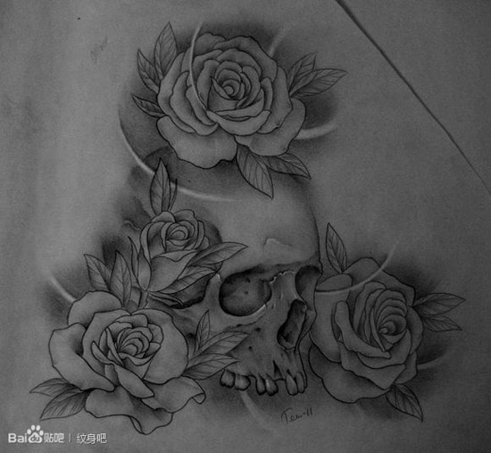 潮流很酷的一款黑灰骷髅与玫瑰纹身手稿
