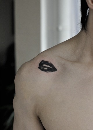 男生肩膀处时尚精美的黑白唇印纹身图案