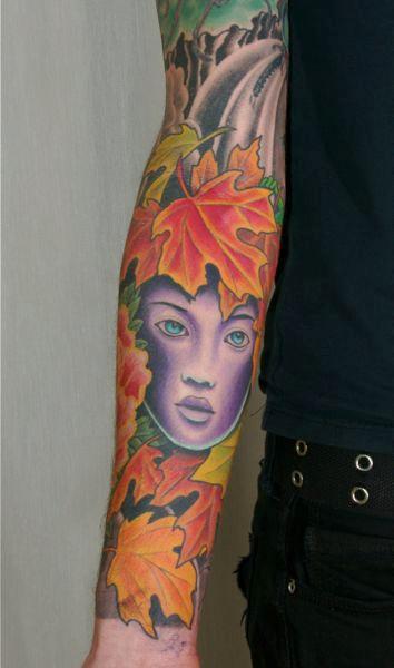 手臂美女枫叶纹身图案图片大全