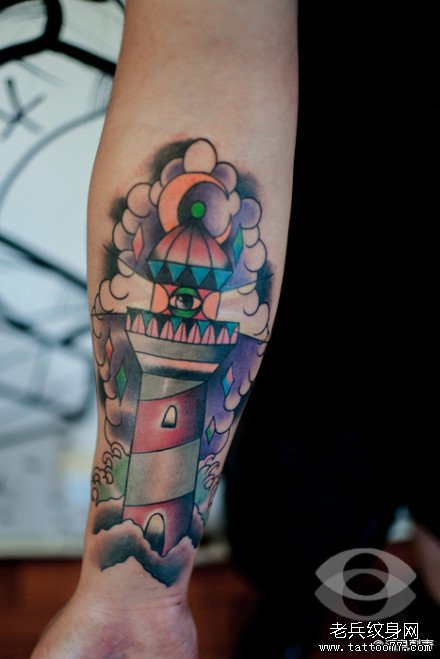 手臂经典时尚的灯塔纹身图案