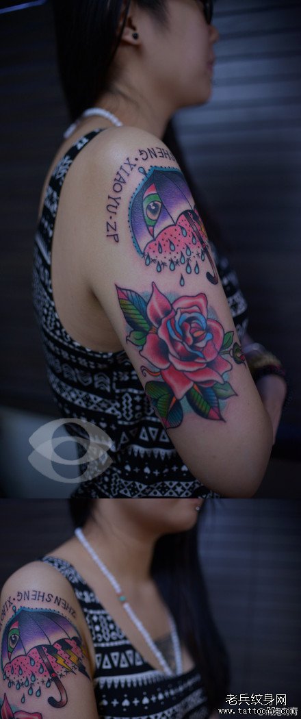 手臂时尚潮流的雨伞与玫瑰花纹身图案