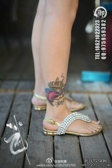 女生腿部唯美时尚的爱心皇冠纹身图案