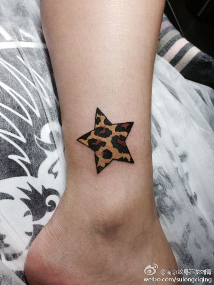 女生腿部潮流时尚的豹纹五角星纹身图案