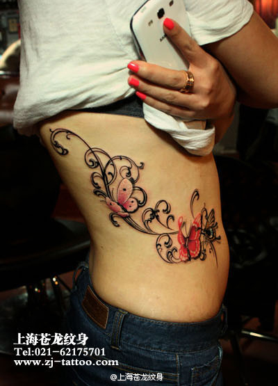 美女侧腰时尚精美漂亮的蝴蝶藤蔓纹身图案