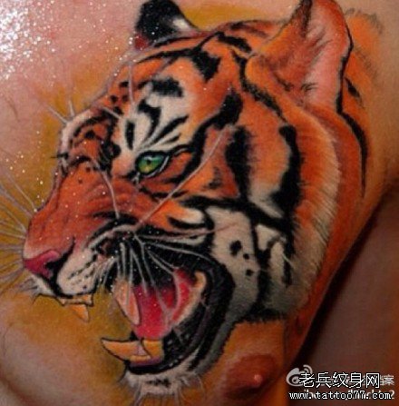男人胸前超酷的彩色虎头纹身图案