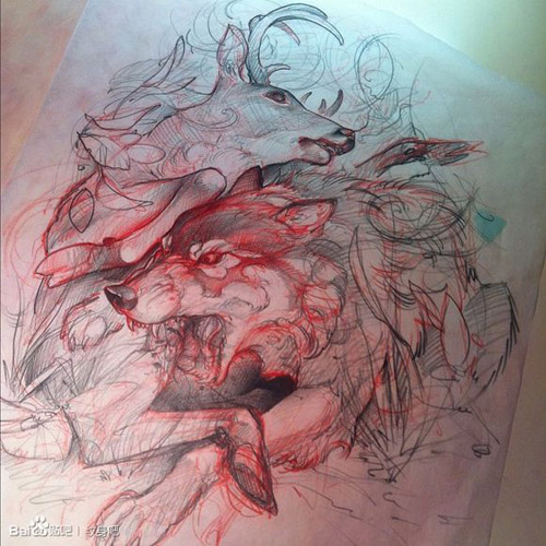 一款经典很帅的狼与鹿纹身图案