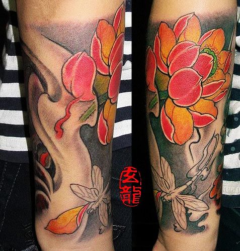 湖北黄冈纹身店:手臂莲花蜻蜓纹身图案图片