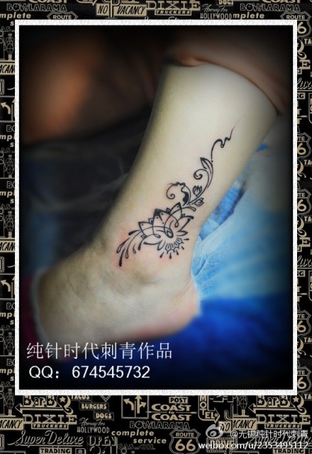 女生脚踝处潮流漂亮的莲花藤蔓纹身图案