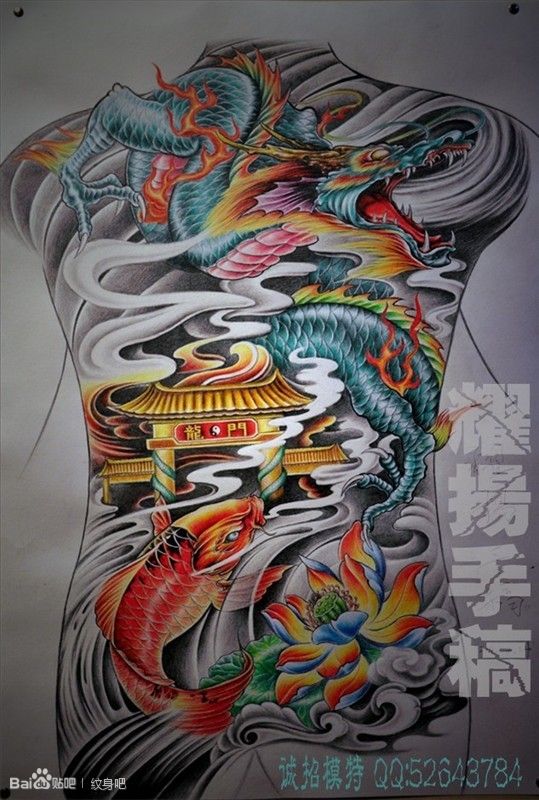 经典超酷的一款满背鲤鱼跃龙门纹身图案