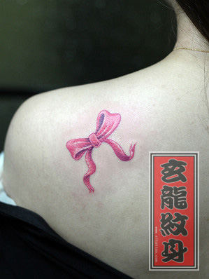 女生肩背漂亮的彩色蝴蝶结纹身图案