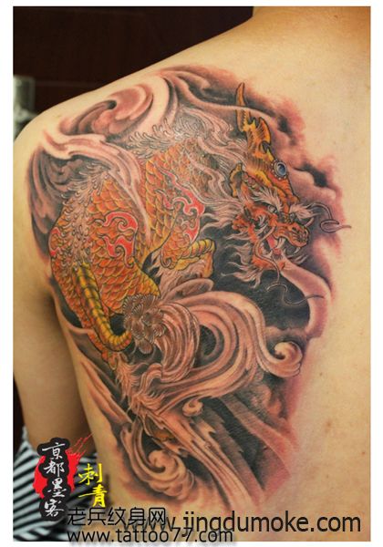男人后肩背潮流经典的麒麟纹身图案