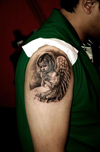 专业纹身店:大臂黑白天使纹身图案图片大全