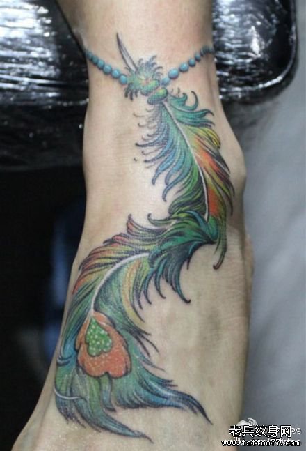 女生脚背漂亮时尚的彩色羽毛纹身图案