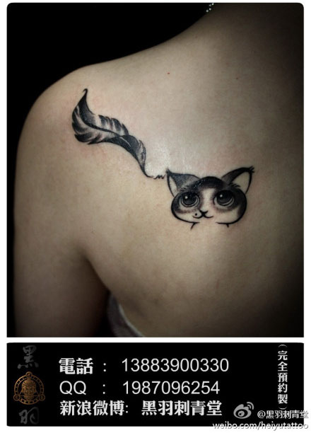 女生肩背唯美的黑灰羽毛与可爱的小动物纹身图案