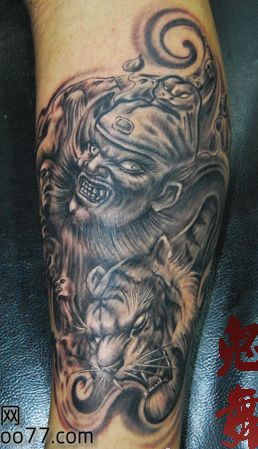 腿部霸气的钟馗老虎纹身图案