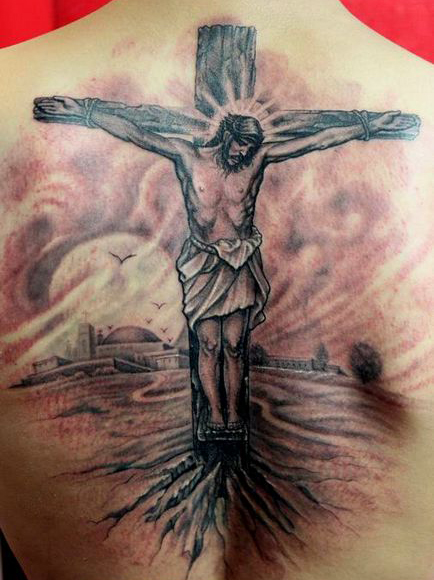 背部一款十字架耶稣纹身图案