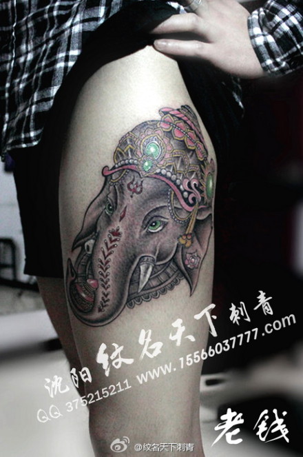 女生腿部时尚潮流的传统象神纹身图案