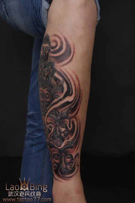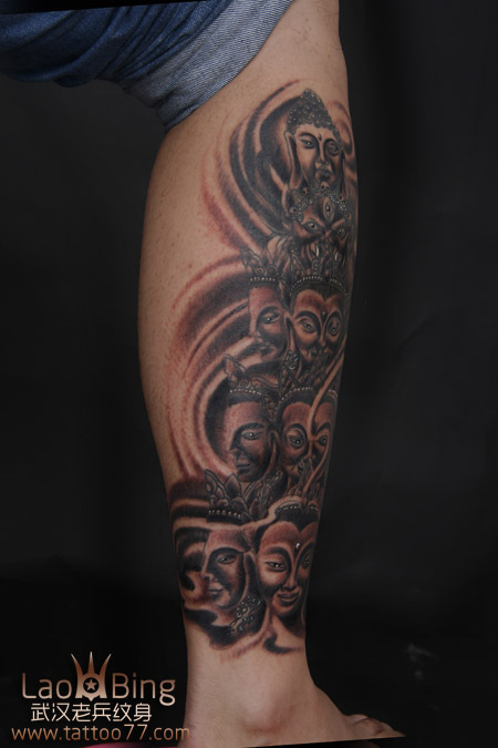 武汉专业纹身店:帅气的腿部十一面佛纹身图案作品
