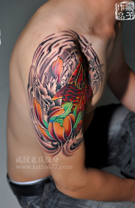 遮盖疤痕,大臂鲤鱼莲花纹身作品