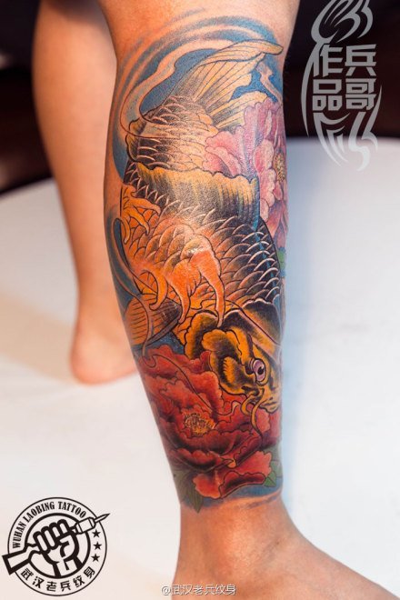 武汉最好纹身店打造的遮盖疤痕--小腿鲤鱼牡丹纹身