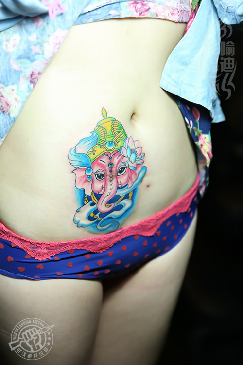 武汉专业纹身店打造的疤痕遮盖--腹部象神纹身作品