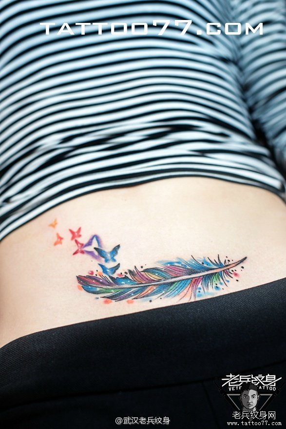 腹部羽毛刺青图案作品遮盖剖腹产疤痕