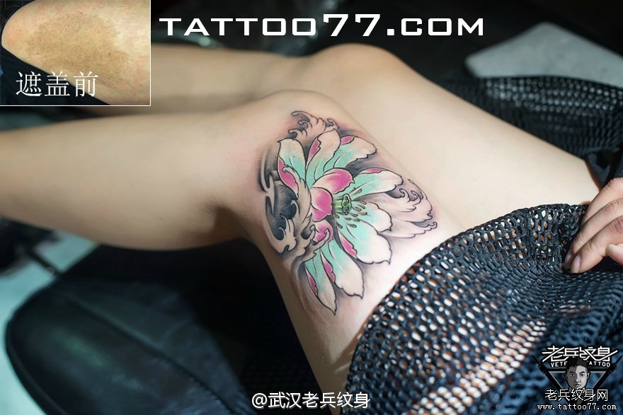 武汉老兵纹身店腹部黑灰花朵遮盖疤痕文身作