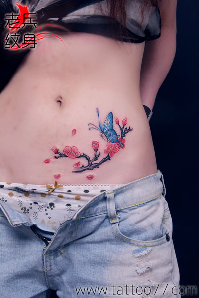 疤痕遮盖:美女腹部梅花蝴蝶纹身
