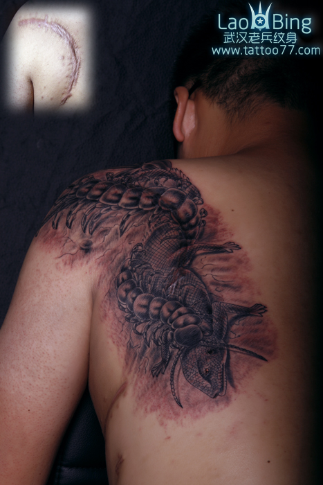 武汉纹身店:疤痕遮盖--背部蜈蚣蜥蜴纹身图片作品