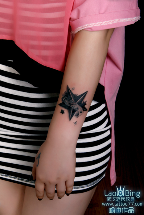 武汉纹身店:遮盖疤痕--手臂五角星纹身图案作品