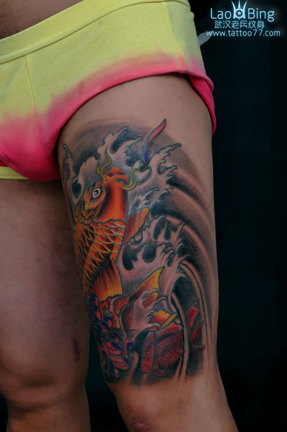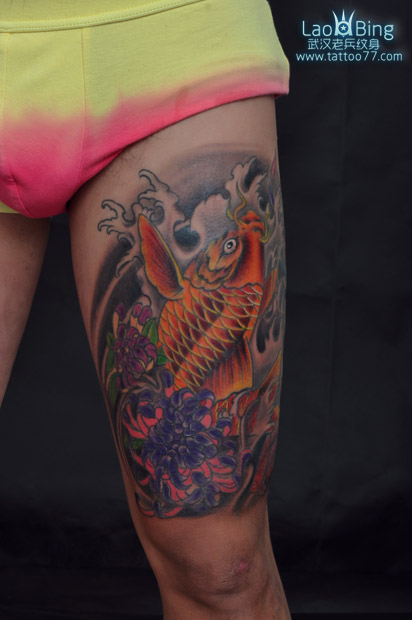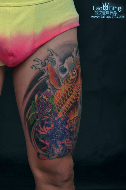 武汉专业纹身店:腿部鲤鱼菊花纹身图案作品