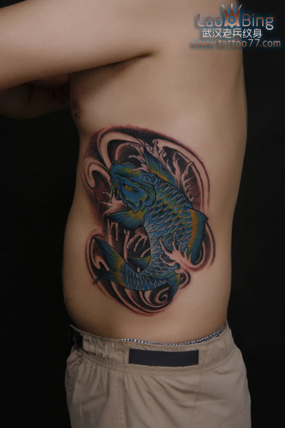 武汉专业纹身店:帅气的腰部鲤鱼纹身图案作品