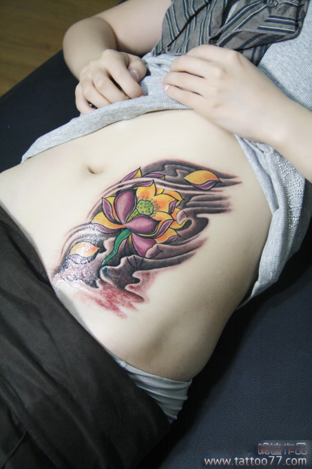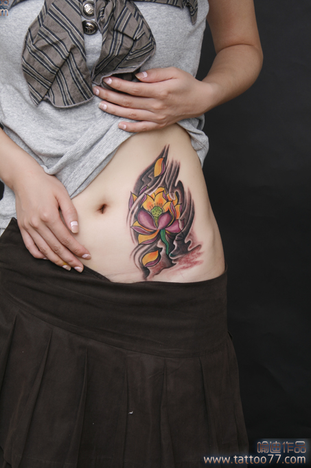 武汉专业纹身店:遮盖白斑--美女腹部莲花纹身图案作品