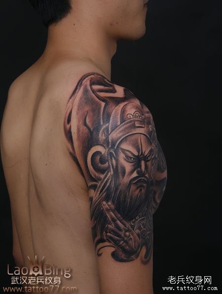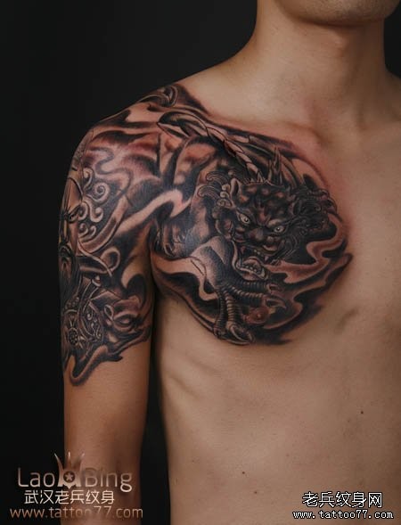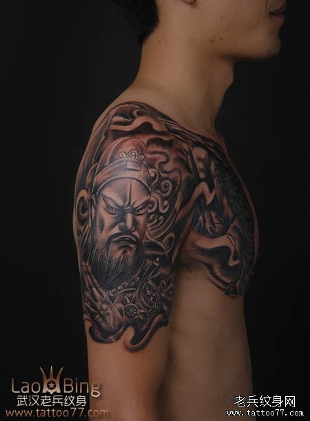 武汉专业纹身店:霸气的半胛貔貅关公纹身图案作品