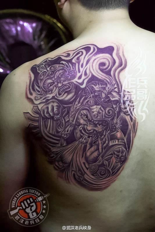 武汉老兵纹身首席纹身师李哲强力打造的背部哼哈二将纹身作品