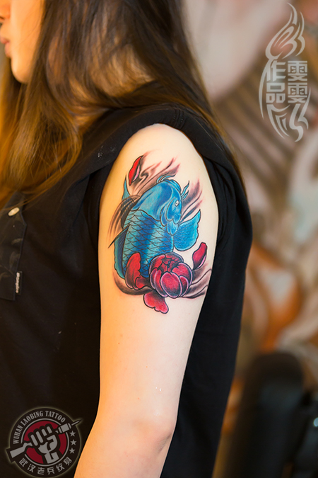 武汉纹身店打造的后背鲤鱼莲花纹身作品