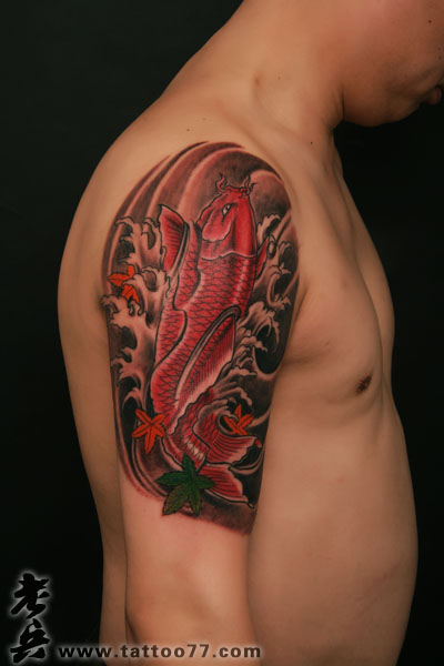 武汉纹身店:大臂鲤鱼枫叶纹身